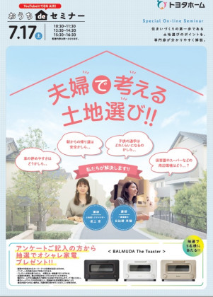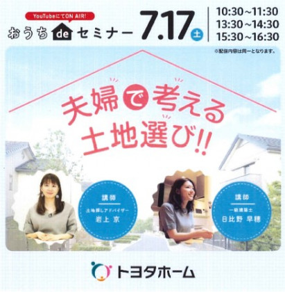 7/17は‼YouTubeにてONAIR‼おうちdeセミナー開催!お題は、~夫婦で考える土地選び~
