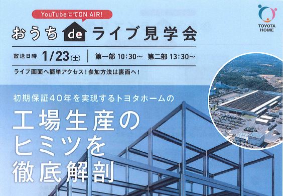 1/23(土)は YouTubeで おうちdeライブ見学会~工場見学バージョン~のお知らせ。
