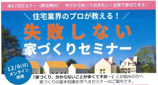 12/6(日)オンラインで開催 失敗しない家づくりセミナーのお知らせ♪