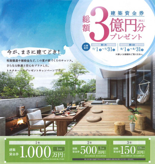 今 お家づくりをお考えの皆さま ぜひ トヨタホームの建築資金券に ご応募くださいませ❁
