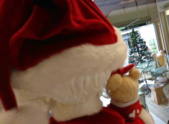 サンタさんも寒がりで? ちびチェツくまさんと おうちの中からツリーを眺めております☆