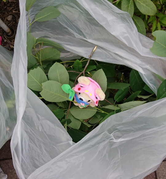 ピンクカエルのちびチェツくまさん じゃましてます?葉っぱのベット?ゴミ袋の中で遊んでます(/・ω・)/