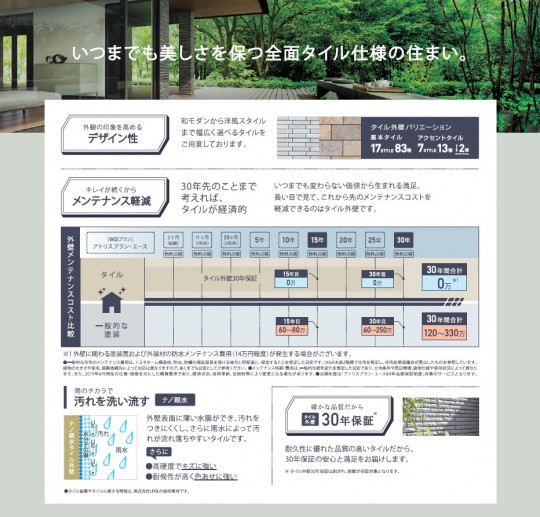 いつまでも美しさを保つ全面タイル仕様の住まい。