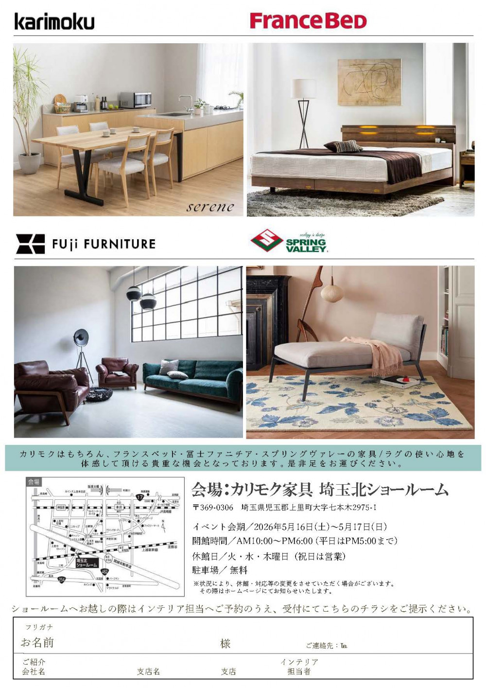 | 場所 | カリモク家具埼玉北ショールーム(埼玉県児玉郡上里町大字七本木2975-1) (MAP) |