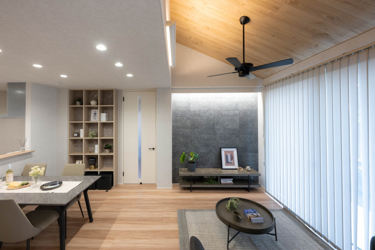 勾配天井が伸びやかなLDK。木目天井が柔らかな雰囲気を演出すます。 -