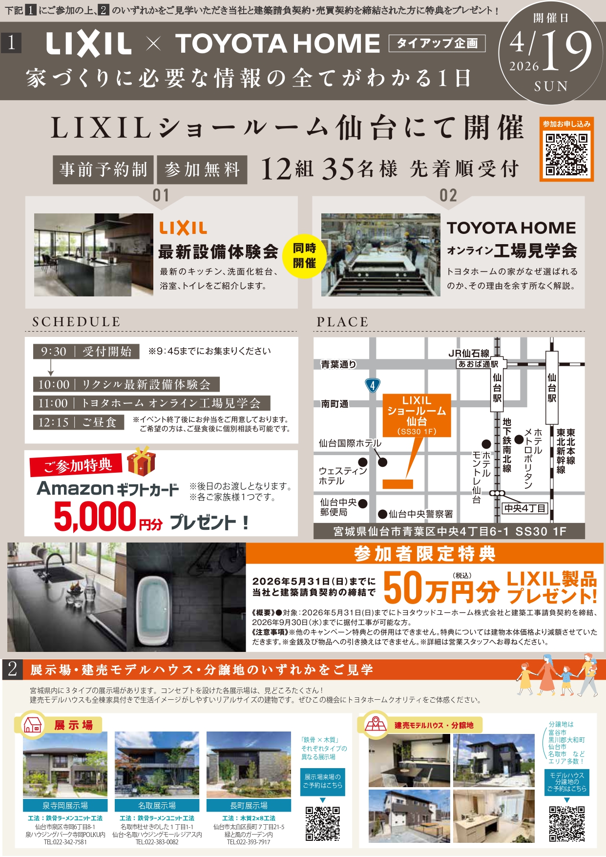 【宮城支店限定】3月決算建築資金券キャンペーン!お申込2/27(金)~3/20(金)まで 【お申込み条件】 1.4月19日(日)開催『LIXIL最新設備見学&オンライン工場見学会』のご参加 2.トヨタホーム展示場、分譲モデルハウス、分譲地のいずれかのご見学 以上を条件とし、期間中に当社と建築請負契約または売買契約を締結された方に限ります。 【建築資金券キャンペーンお申込】 詳細は展示場スタッフよりご案内申し上げます。 Tweet